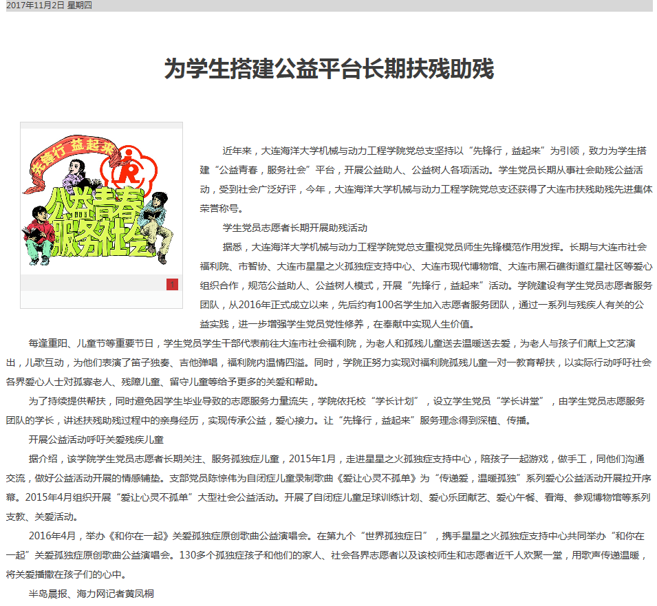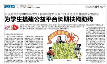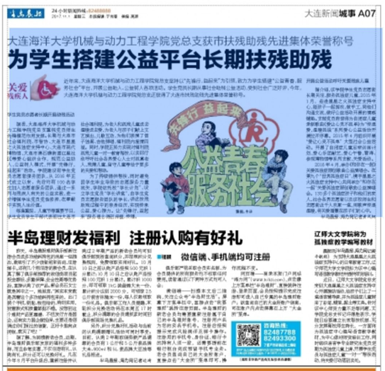 11月1日,《半岛晨报》A07版对我校澳洲彩票(中国)官方网站 党总支获大连市扶残助残先进集体荣誉称号,为学生搭建公益平台长期扶残助残先进事迹进行了报道。