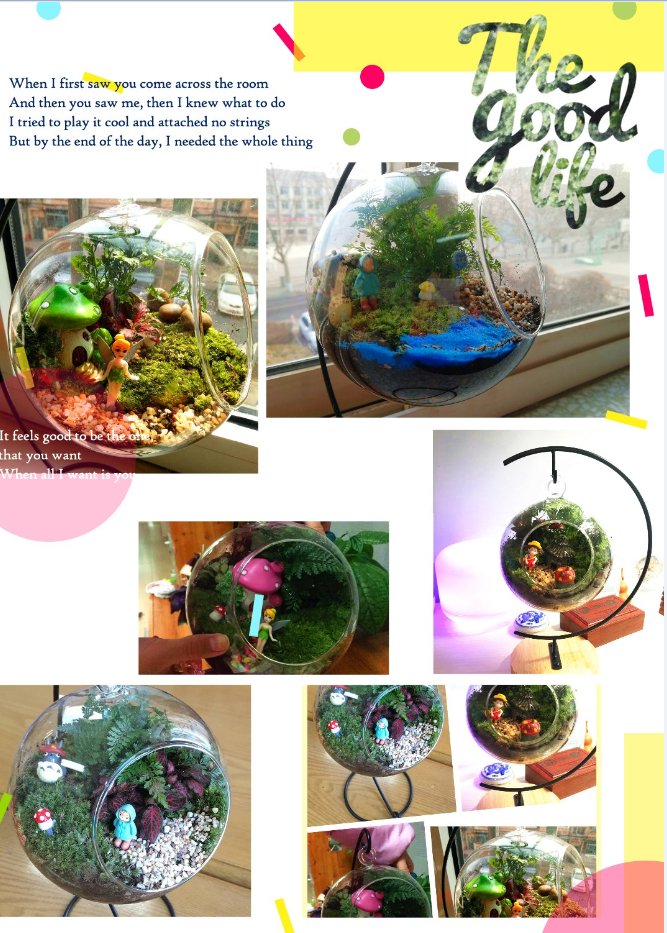 微景观是将真实世界的景色利用手工拼装制作,并以绿色植物为主体,搭配相近环境下生长的观叶植物以及精致的道具,将苔藓、多肉等植物,加上各种篱笆、砂石、可爱的卡通人物、动物装进一个瓶子里,构成妙趣横生的场景。大家学习讲解,亲手制作属于自己的苔藓微景观,获得成就感。