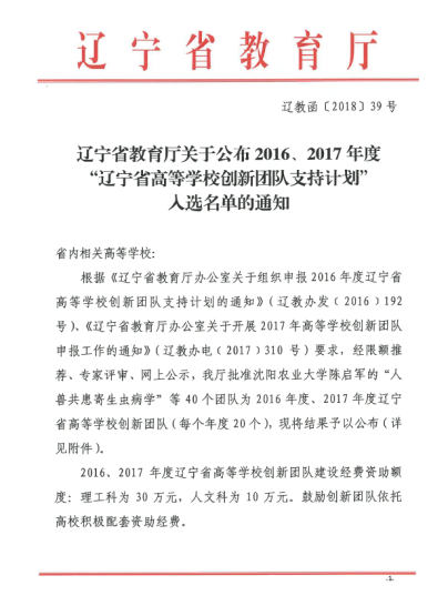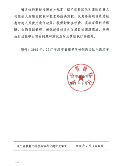 该创新团队于2015年进行申报。此次入选辽宁省高校创新团队支持计划的团队名单包括2016年、2017年两个年度的获批情况。