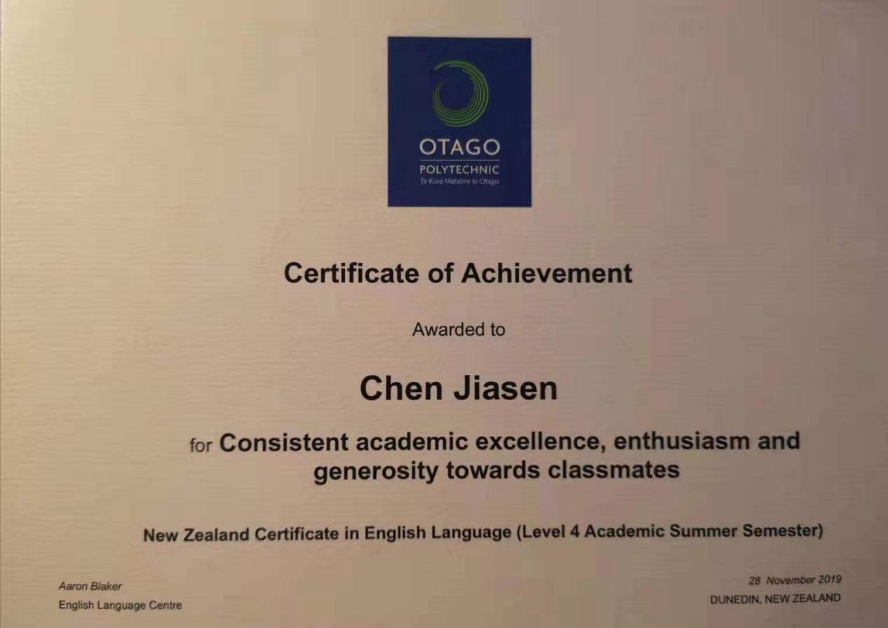 11月28日,在新西兰奥塔哥理工学院Level4语言课程结业典礼上,2016级陈嘉森,张森林两名同学被奥塔哥理工学院语言中心评为优秀毕业生,并颁发证书以资鼓励,此次仅两位中国学生获此殊荣。