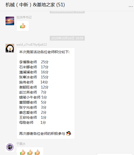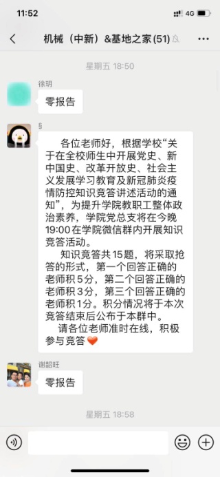为了进一步教育引导学院师生全面了解我们党成立以来、新中国成立以来以及改革开放以来的重大事件、重要会议、重要文件、重要人物,进一步增强基层党组织的凝聚力和战斗力,学院党总支于10月16日晚开展竞答交流分享活动,依托网络平台,设置讲述展示和参观竞答两个环节,充分用好讲党课这一党的组织生活制度,组织全院师生观看刘焕英、谢韶旺两位老师前期录制的党课视频,切实增强党员教育的针对性实效性,观看党课视频后,以竞答讲述的形式推进学习教育,组织全体党员利用微信群线上开展党的知识竞答。