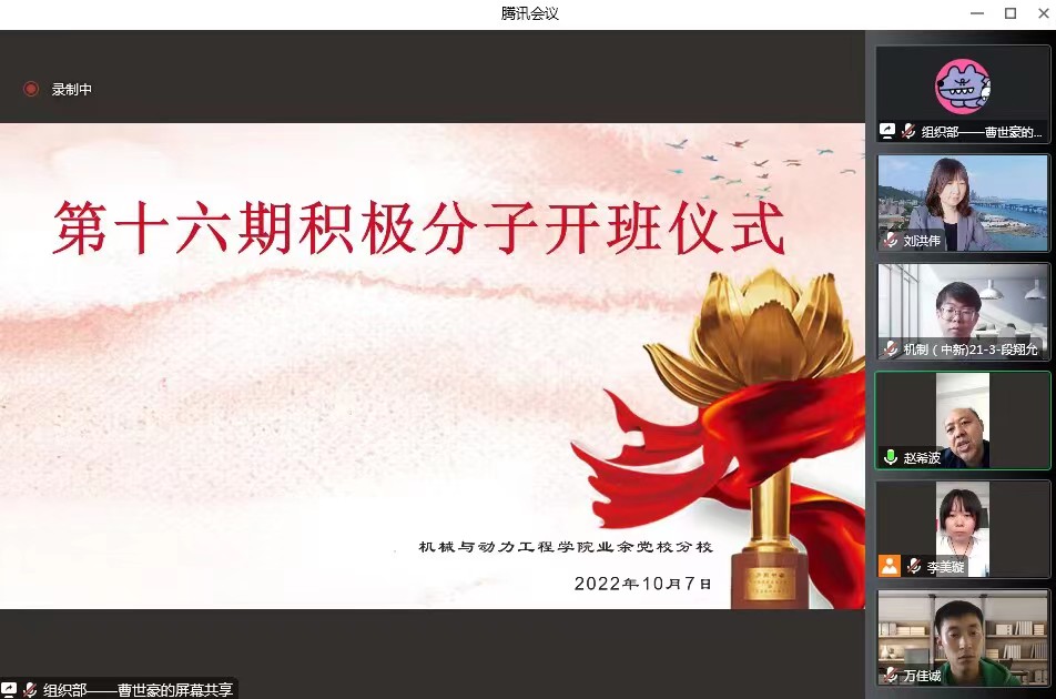 业余党校于2022年10月7日通过线上方式举行第十六期入党积极分子开班仪式。学院党总支书记赵希波,副书记刘洪伟,本科生党支部书记李美璇,组织员李雅奇和47名入党积极分子参加了开班式。