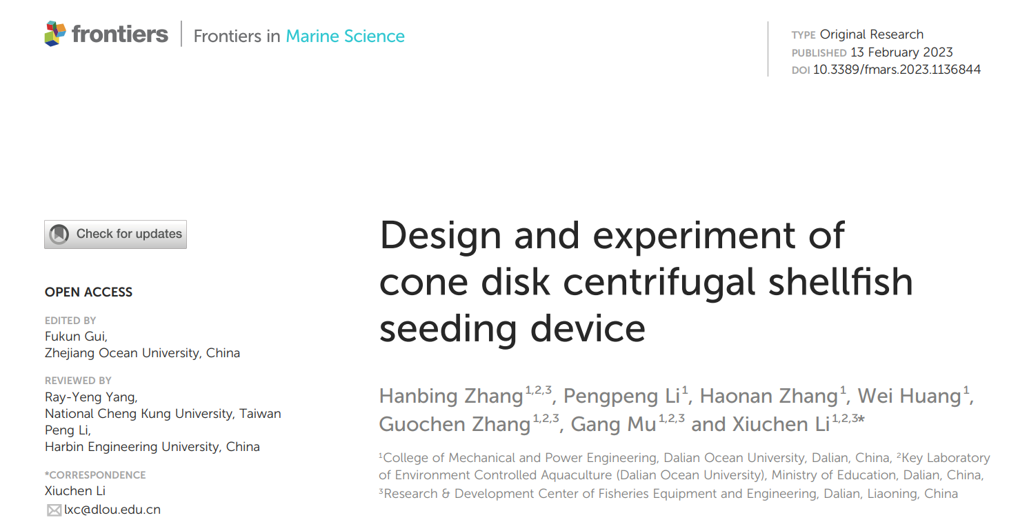 近日,海洋学领域国际知名期刊Frontiers in Marine Science(影响因子为5.247,JCR分区为Q1,中科院分区生物学大类2区、海洋与淡水生物学1区)在线发表了我校机械工程学院张寒冰博士为第一作者、李秀辰教授为通讯作者的研究论文“ Design and experiment of cone disk centrifugal shellfish seeding device”。本研究是在国家蓝色粮仓重点研发计划和省市课题的支持下开展的,论文研究了一种锥盘离心式贝类播苗装置,探明了贝苗播撒运动规律,建立了播散全过程动力学模型,利用离散元仿真技术对主要结构和作业参数进行了优化,并完成了整机性能测试,为滩涂贝类播苗机械设计提供重要参考。